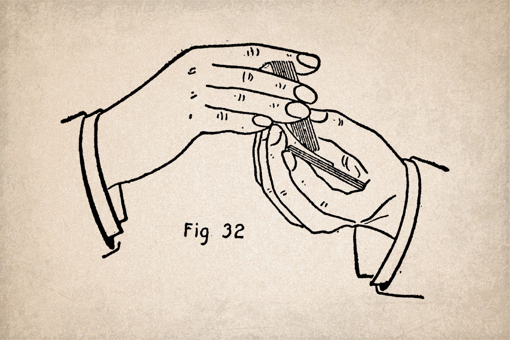 Seize the deck at ends between the second finger and thumb of the right hand in the usual manner for shuffling, the first finger resting on the side. Run several cards into the left hand, but well down into the palm, so that the second and third fingers protrude to the first joints from underneath. Then when the right hand has made the next downward motion, instead of drawing off the top card with the left thumb press the left second and third fingertips against the bottom card and let it slide into the left hand, drawing it into position on the other cards with the left thumb as the right hand is raised. (See Fig. 32.)